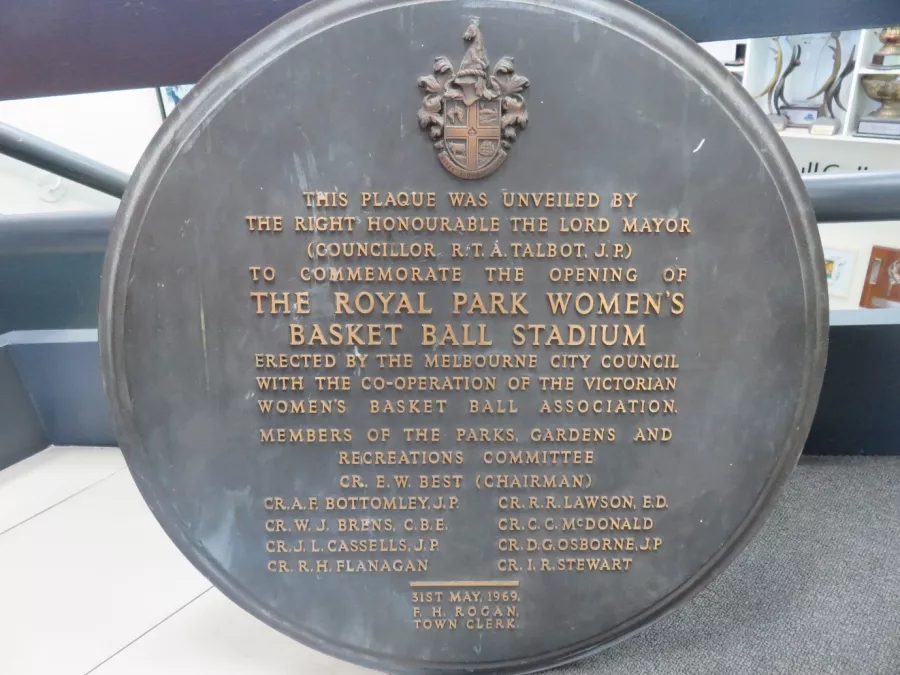 Royal Park has a long history associated with netball in Victoria, and this large, heavy, metal plaque - now part of the Edith Hull Collection at Netball Victoria - was originally unveiled at the opening of the ‘Women’s Basket Ball Stadium’ on May 31, 1969.